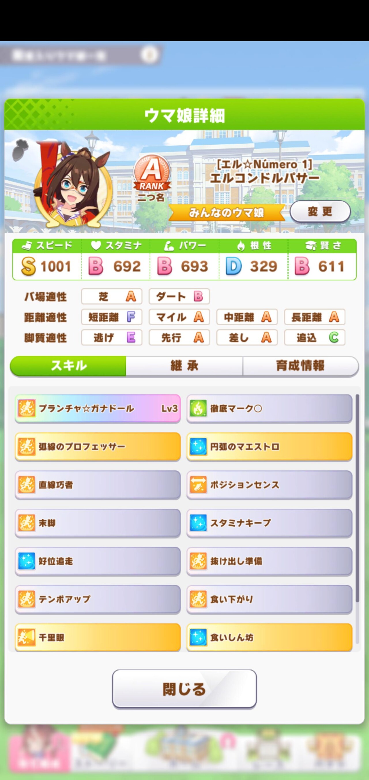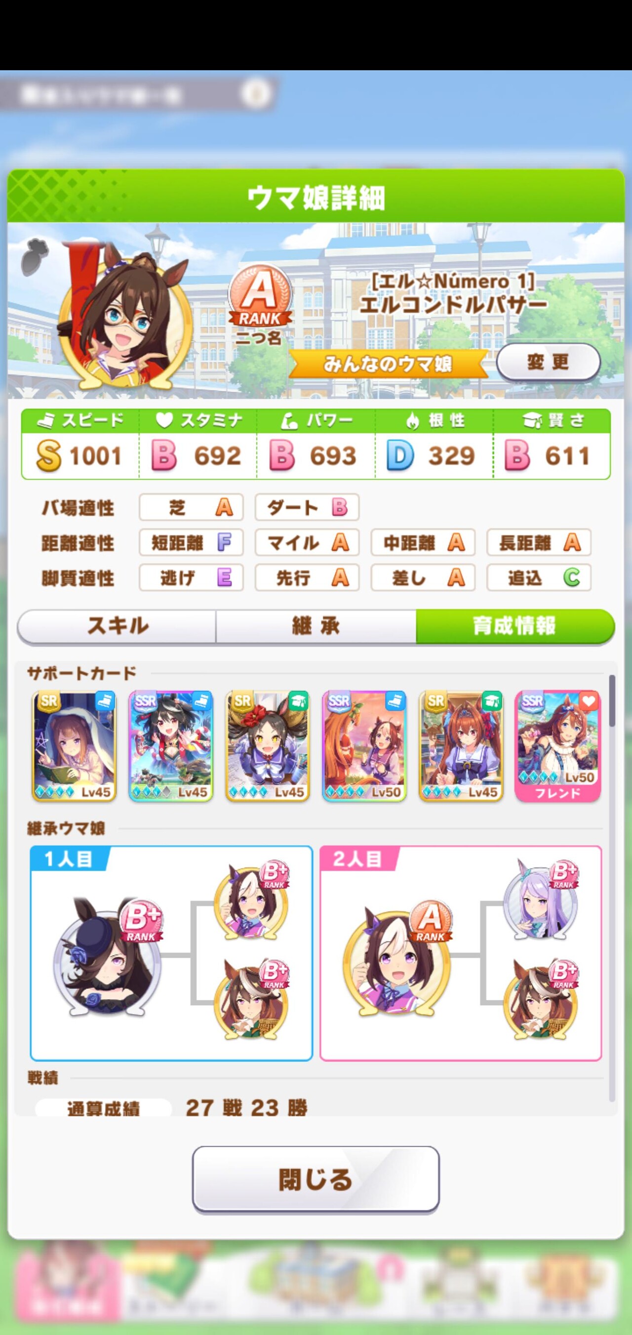100万育成、馬車馬の如く走るだけかと思ってましたがこんな感じなんですね。マイル長距離走ること考えるとほんとマルゼンさんが最適解な気がします。さすがゲキマブ。