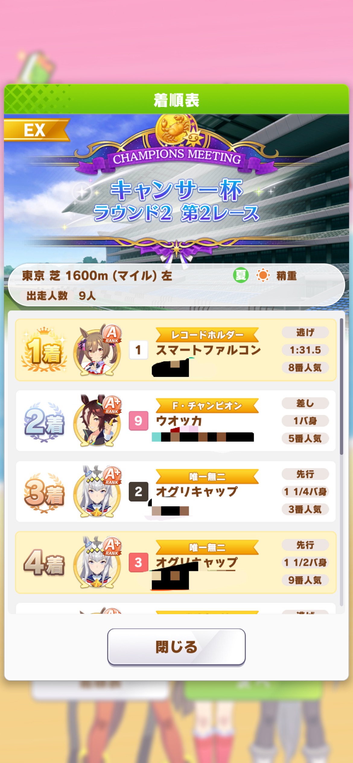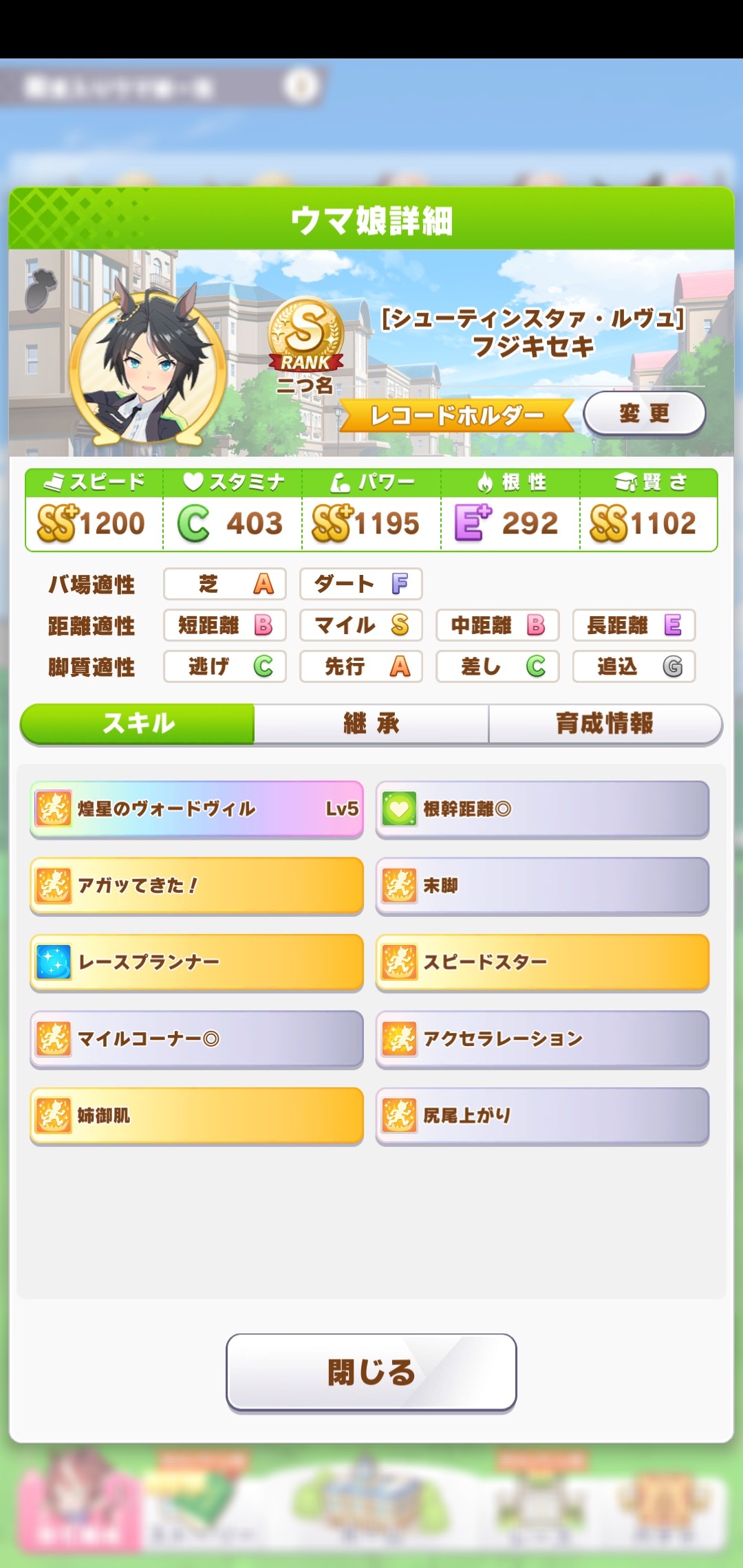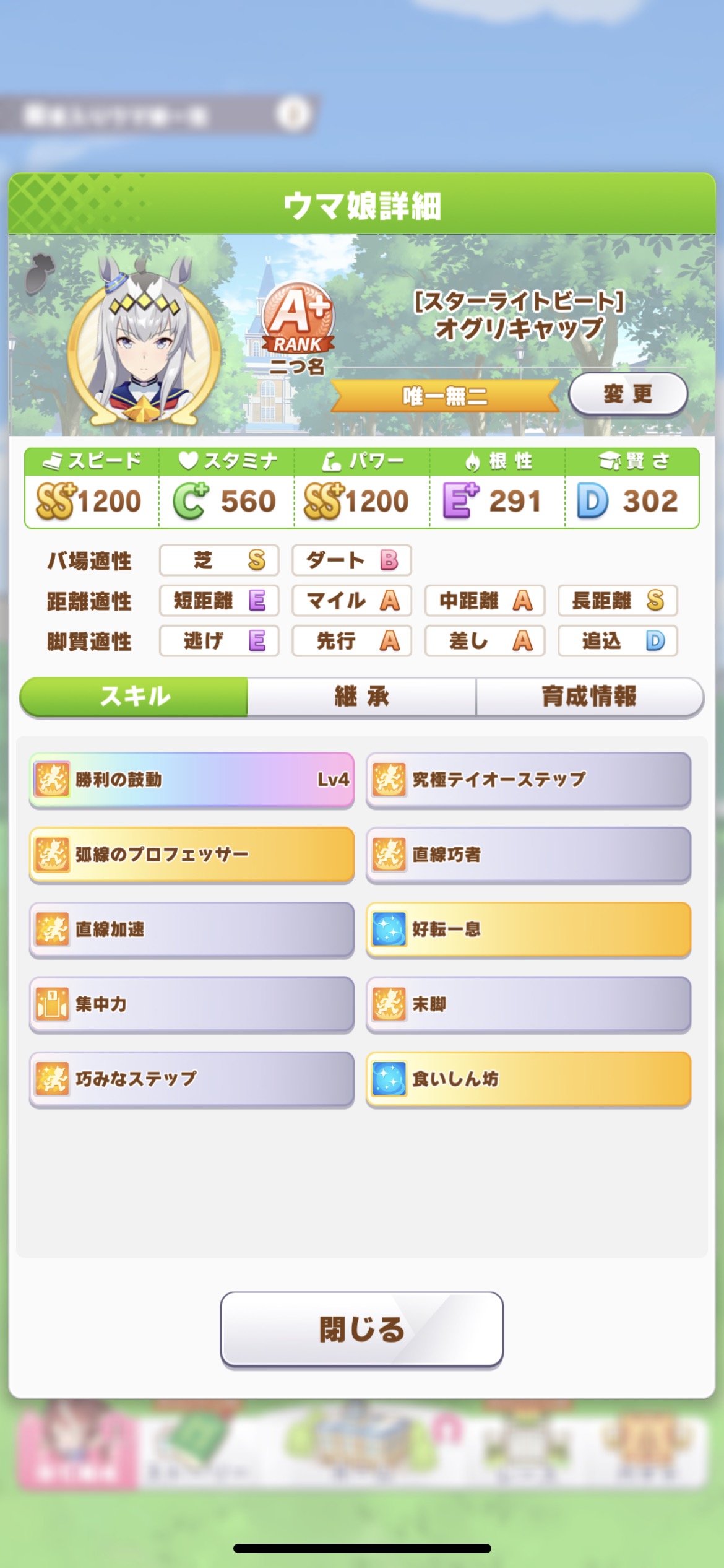 ステータスは似てるようで片や勝ちそうで片や勝ててない二組ですがやっぱり賢さの差が大きそうですね。賢さ少ないとスキル発動率的にもステータスでちゃんとカバーしたいところ。逆にフジキセキくらい賢さが盛れてればまあ行けるでしょ!