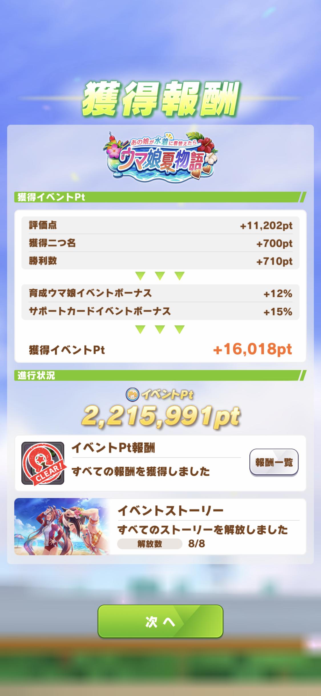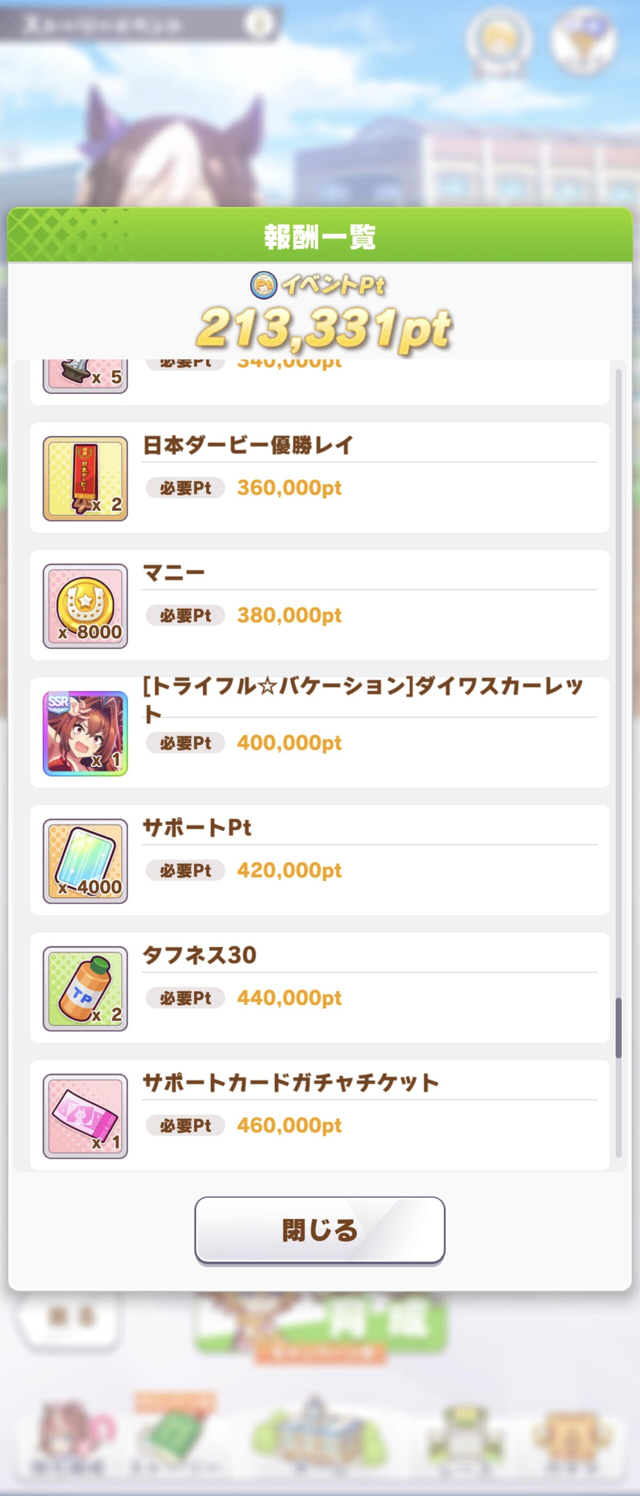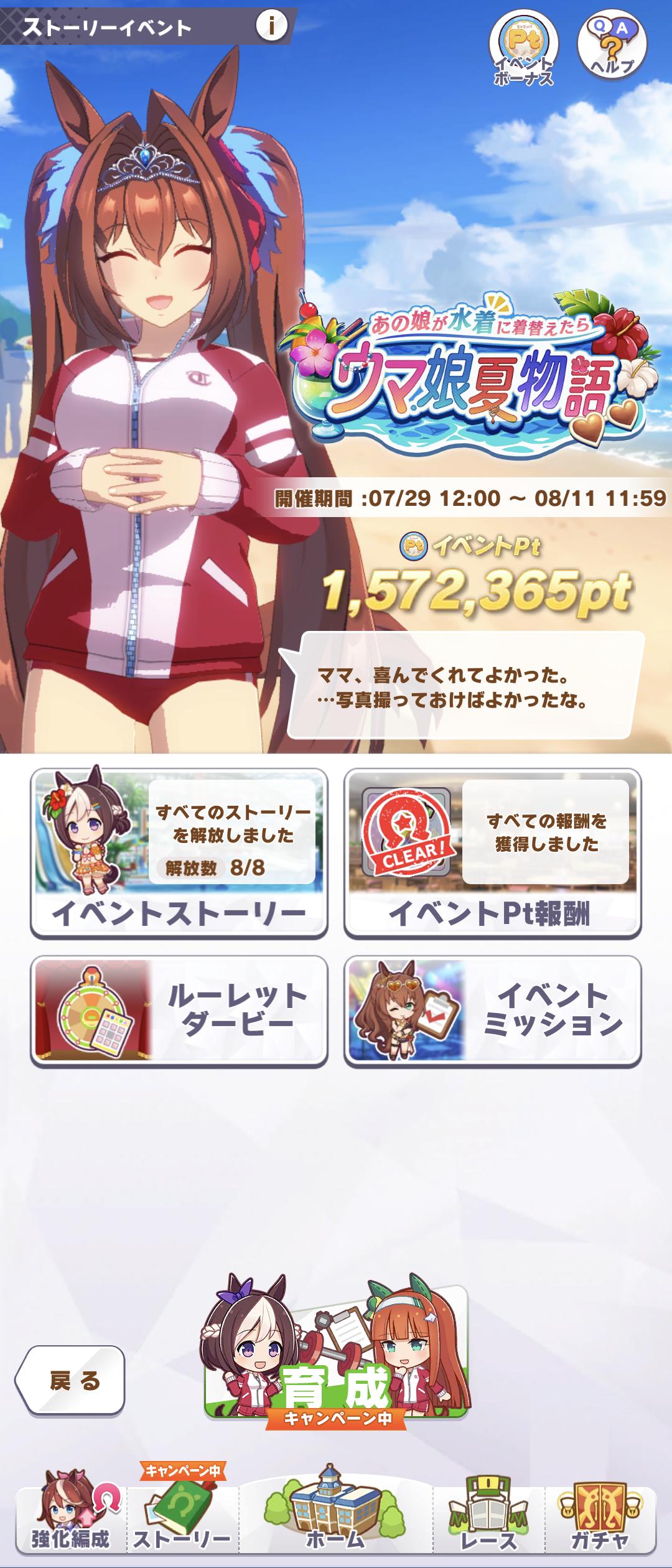 おそらく計算上は一日一育成でもサポカ交換は終わってそう? どっちかというと称号の育成回数の方が厳しそう。自分の友人も昨夜マックEーン連打して稼いでました。