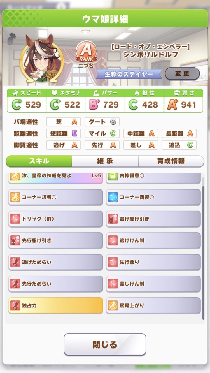 逃げ0対策のブースター兼デバフ係というまさによくばりセットな育成みたいですね。スレマだと逃げ0になることもしょっちゅうみたいですし。