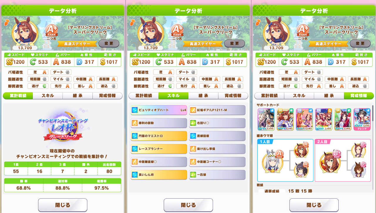 中盤までの速度系はステ十分なら金スキルより白スキルを複数取った方が事故が低くてベター、ステが十分でない場合は事故リスク抱えてでも上振れ発動にワンチャンするのもありかなと思う