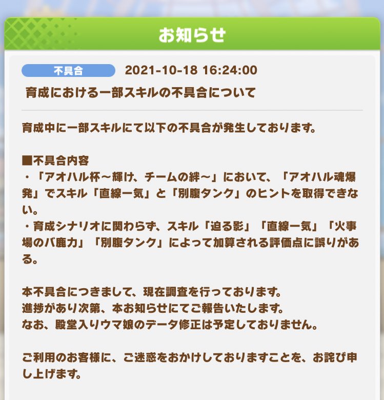 「全てのスキルが出ます」なんてどこにも書いてないんだから、『出る対象に加えていません』で良いのに。不具合何て表現するから馬鹿が騒ぐんだ。