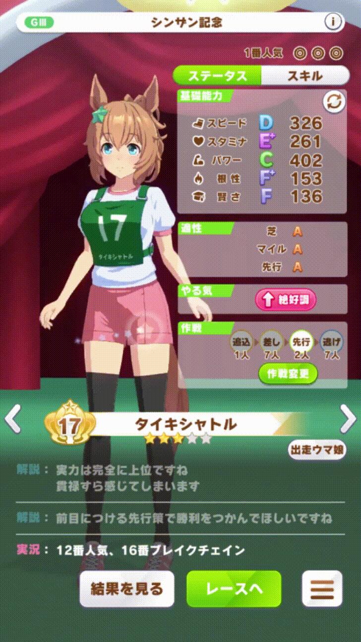 初心者でも簡単にクリア出来るし、ダートに流用可能だし、固有スキルも汎用性あるしタイキで良かったと思うわホント