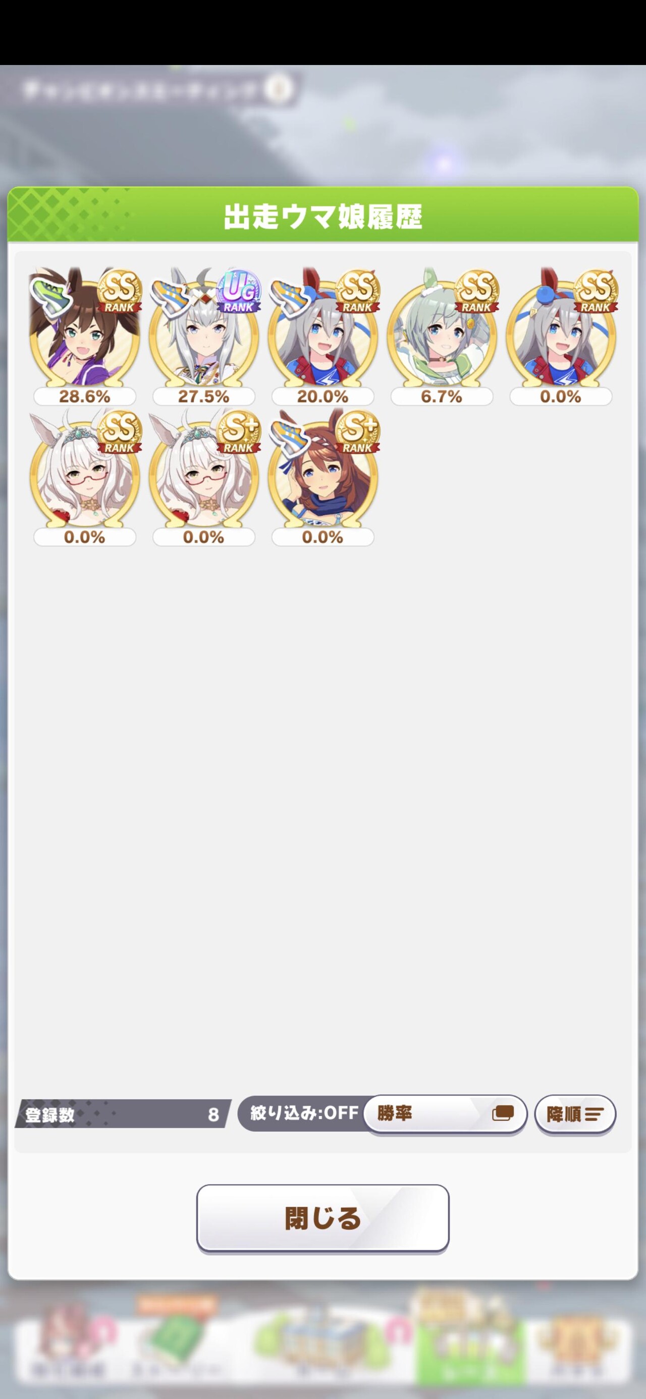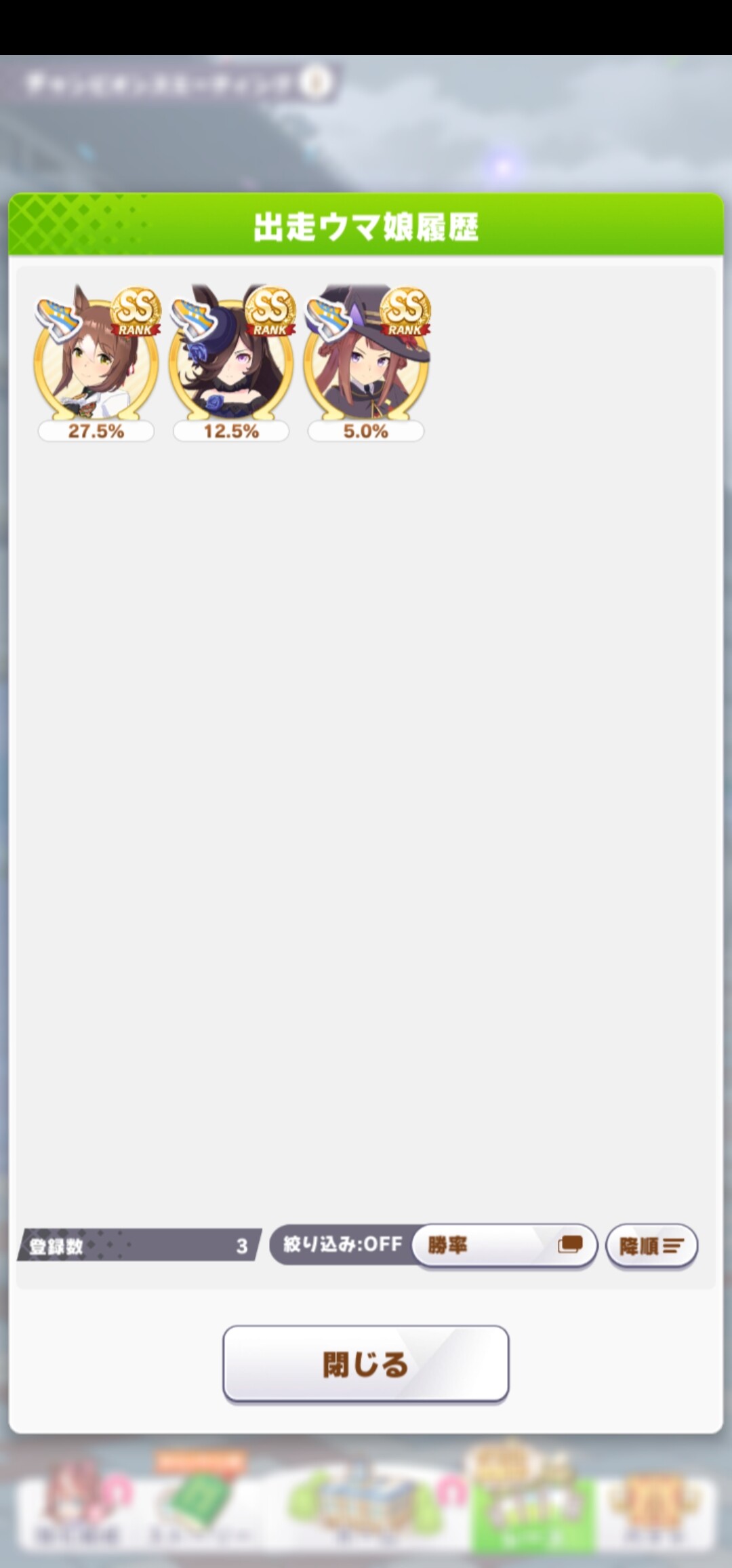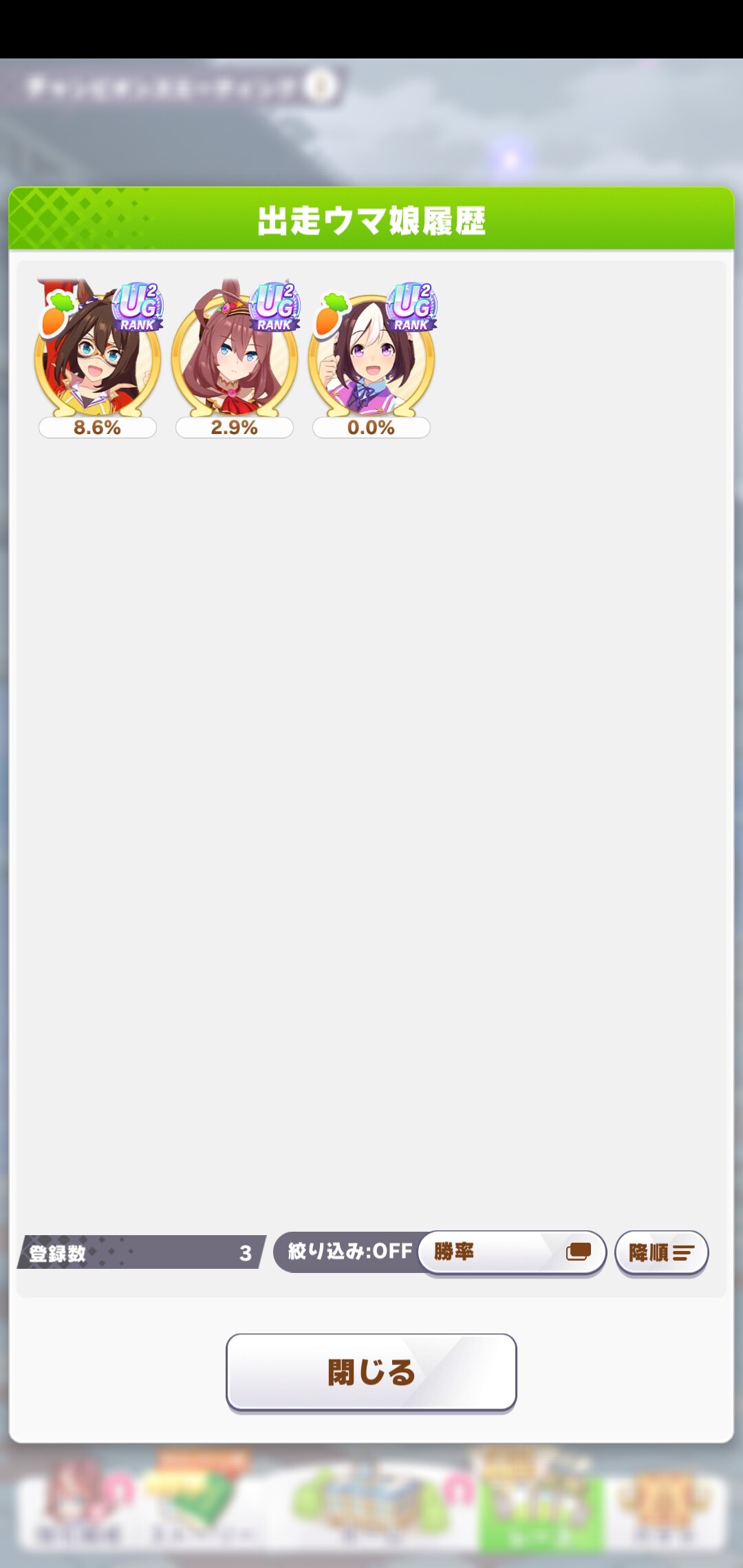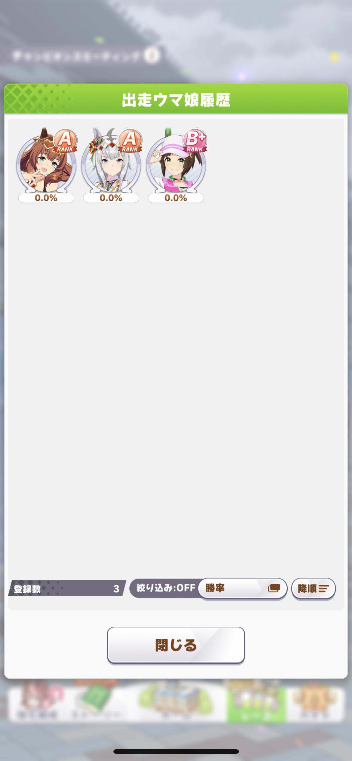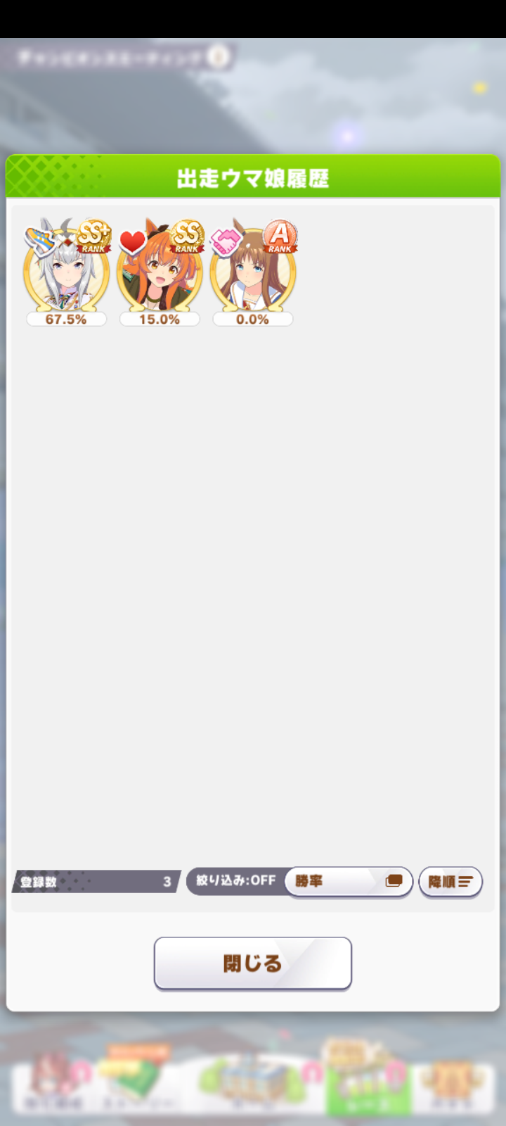 オープン勢だけど良バ場の鬼や晴れの日◎積んでる子がそこそこいて明らかに前回の使い回しだろって感じがしておもろい