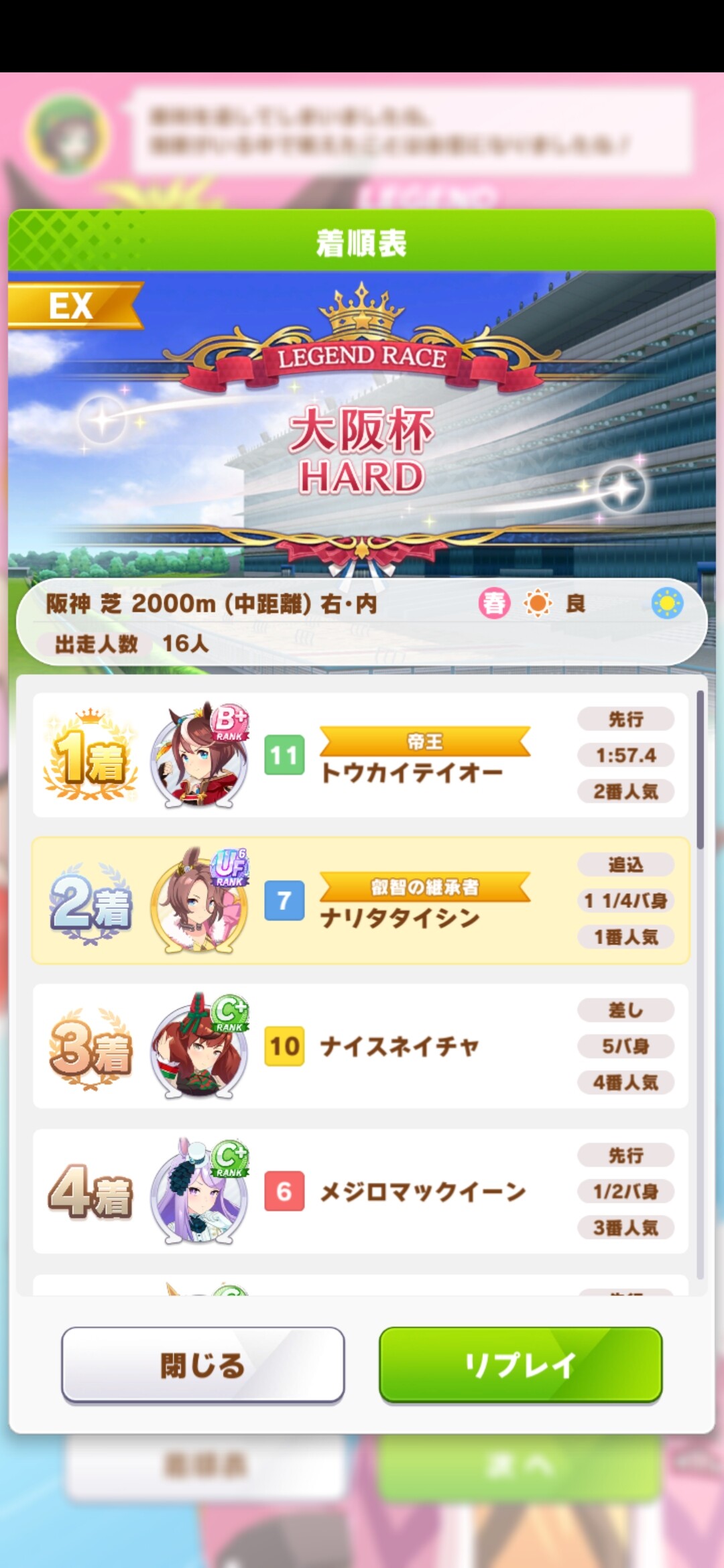 マックイーン出したら終盤入って加速スキル出たタイミングでちょうどモブロックくらってテイオーだけ先に行っちゃってゴール直前でステ差でギリギリ抜くっていう勝ち方をしたわ