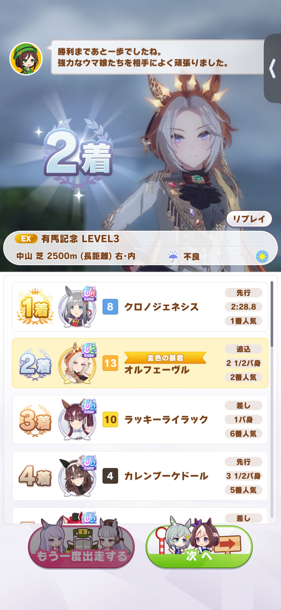 こっちは有馬記念仕様で既に育成してたドンナが全て勝ってくれた