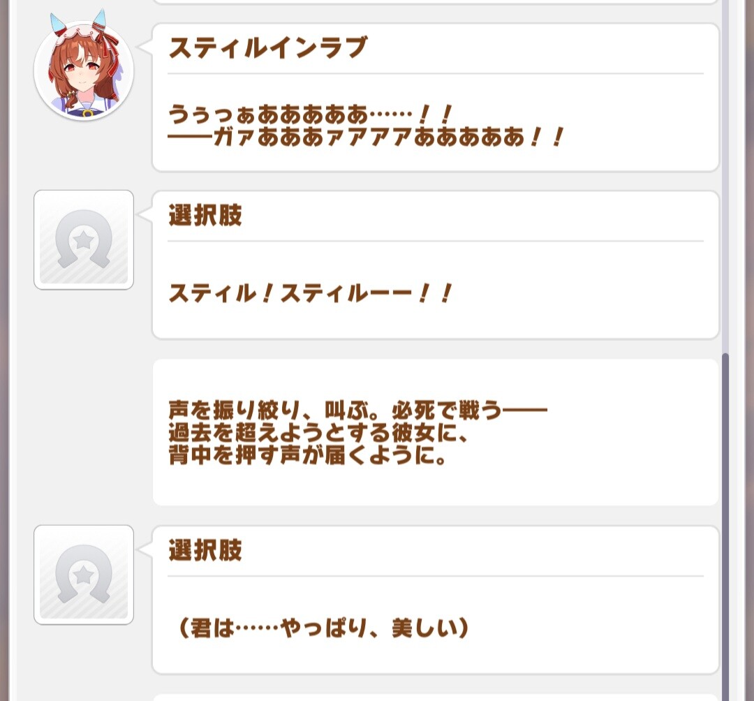 メインストーリー第二部でずっと未来に繋ぐ話をやってきたところでお出しされたトリプルティアラウマ娘が未来なんていらないって言い切っちゃうのがすごい